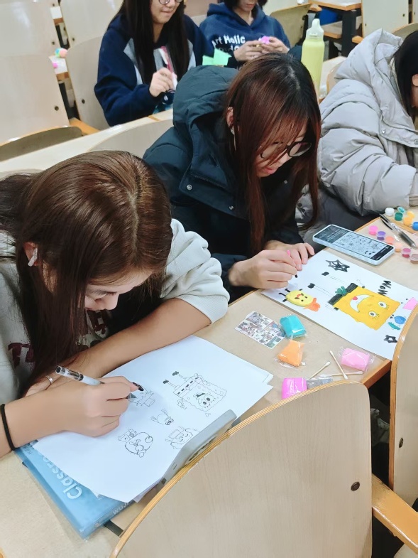 活动围绕“重拾童年”展开,粘土、折纸、绘画三大环节里藏着细腻的心意。粘土区,有同学捏出《西游记》孙悟空,金黄紧箍咒下藏着“放学守着电视等更新”的回忆;折纸区,合作折出的纸青蛙一按便跳,唤起操场边的欢呼;绘画区,老家小院的石榴树、课间跳皮筋的场景,笔尖流淌的是对纯粹时光的眷恋。单人创作时的专注、组队协作时的笑语,让教室成了褪去学术标签的“心灵栖息地”。