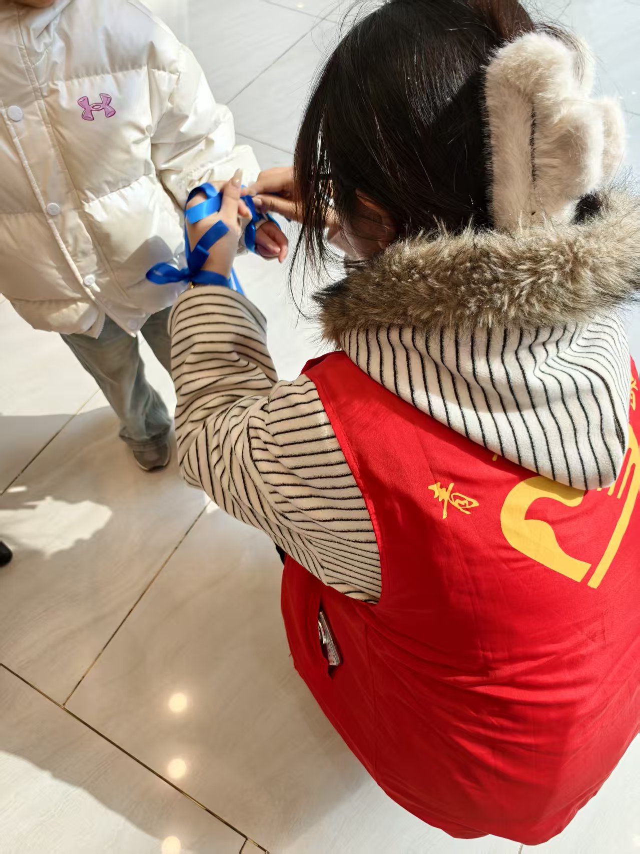 活动当日,志愿者们以饱满的热情投入到各项工作中。活动伊始,全体志愿者在手腕系上象征支持自闭症群体的蓝色丝带。随后,大家各司其职、分工协作:负责公益宣传的志愿者们主动科普自闭症相关知识,打破大众对这一群体的刻板偏见,让更多人读懂“星星的孩子”的世界。