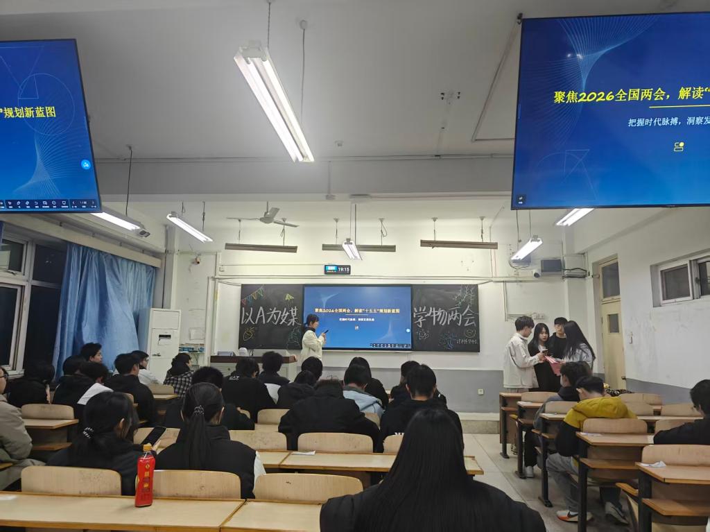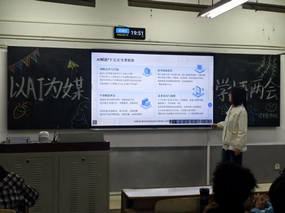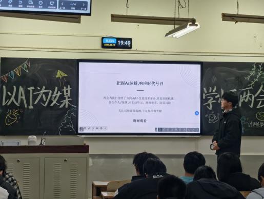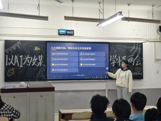 通过PPT展示、上台演讲的形式,让同学们结合计算机专业特色,从“十五五”规划中的数字经济布局,到AI赋能新质生产力的实践路径进行深入剖析,将政策导向与专业学习、职业规划紧密结合。现场气氛热烈,互动频繁,大家在思想交流中深化了对两会精神的理解,也更加明确了作为新时代数字人才的使命担当,掀起了学习两会精神、践行青春使命的热潮。